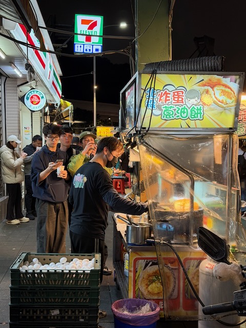 All that aside, the standout food from Shilin was fried egg scallion pancake from a street seller just outside the core of the night market. The cart, situated outside a 7-11 (ubiquitous to the point of being useless as a wayfinding aid), was part of a two location business and grew a line while we were there. The scallion pancake inflated like a balloon as it fried, with the cook managing its position and eventually deflating it with a swift poke. A complex layering of flavors, from egg, a savory/sweet sauce, and a bit of hot sauce, were wrapped in a perfectly flaky scallion pancake. Surely, this is a hangover cure as well as a salve for the pains of the work day?